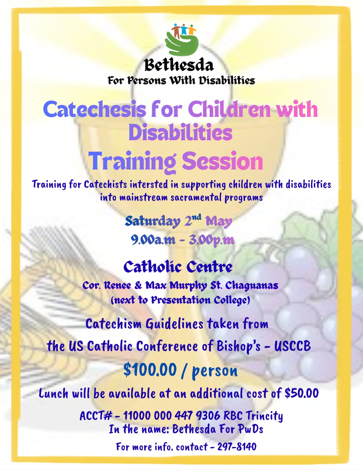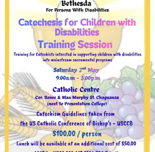 « All Events Bethesda – Catechesis for Children with Disabilities – Training Session May 2 @ 9:00 am - 3:00 pm $TT100 Prev Event Add to calendar Google Calendar iCalendar Outlook 365 Outlook Live Details Date: May 2 Time: 9:00 am - 3:00 pm Cost: $TT100 Event Category: Workshop Organizer Bethesda Catholic Community of Trinidad and Tobago Venue Catholic Centre, Chaguanas Rene Street Chaguanas, Trinidad and Tobago + Google Map