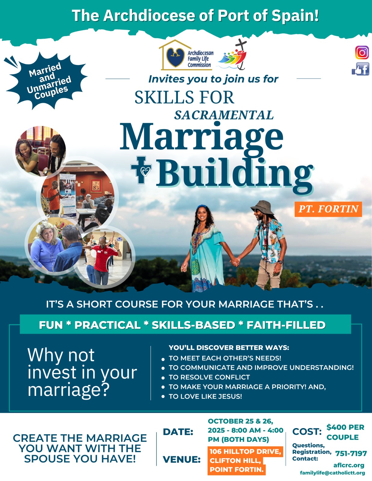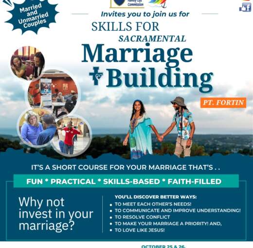 « All Events Skills for Sacramental Marriage Building – Pt. Fortin October 25 @ 8:00 am - October 26 @ 4:00 pm Next Event Register here: https://forms.office.com/r/2e5CbgAQz1https://forms.office.com/r/DXwaXuHKiE Add to calendar Google Calendar iCalendar Outlook 365 Outlook Live Details Start: October 25 @ 8:00 am End: October 26 @ 4:00 pm Event Category: Event Organizer Archdiocesan Family Life Commission Phone: 299-1047 Email: familylife@catholictt.org Venue Point Fortin