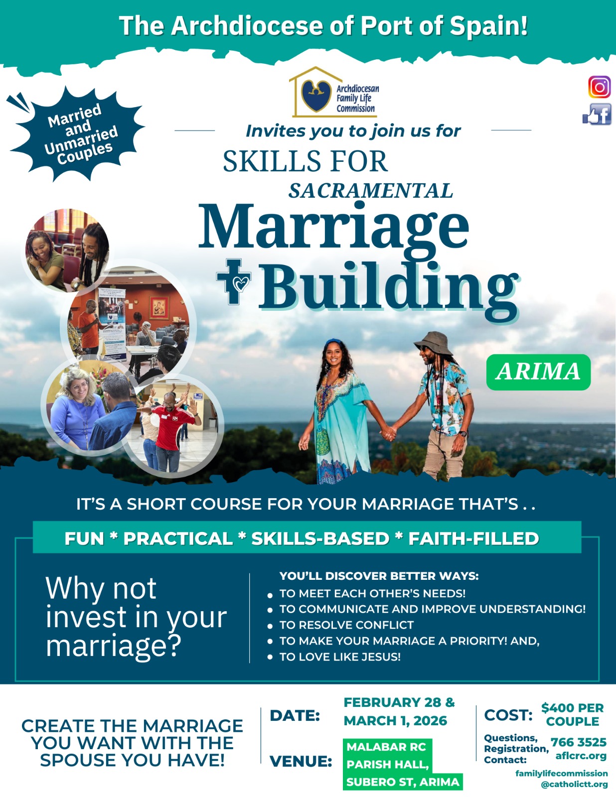 « All Events Sacramental Marriage Building – Arima February 28, 2026 @ 8:00 am - March 1, 2026 @ 4:00 pm Prev Event Add to calendar Google Calendar iCalendar Outlook 365 Outlook Live Details Start: February 28, 2026 @ 8:00 am End: March 1, 2026 @ 4:00 pm Event Category: Event Organizer Malabar RC Parish Venue Malabar Parish Malabar, Trinidad And Tobago + Google Map