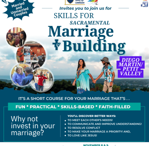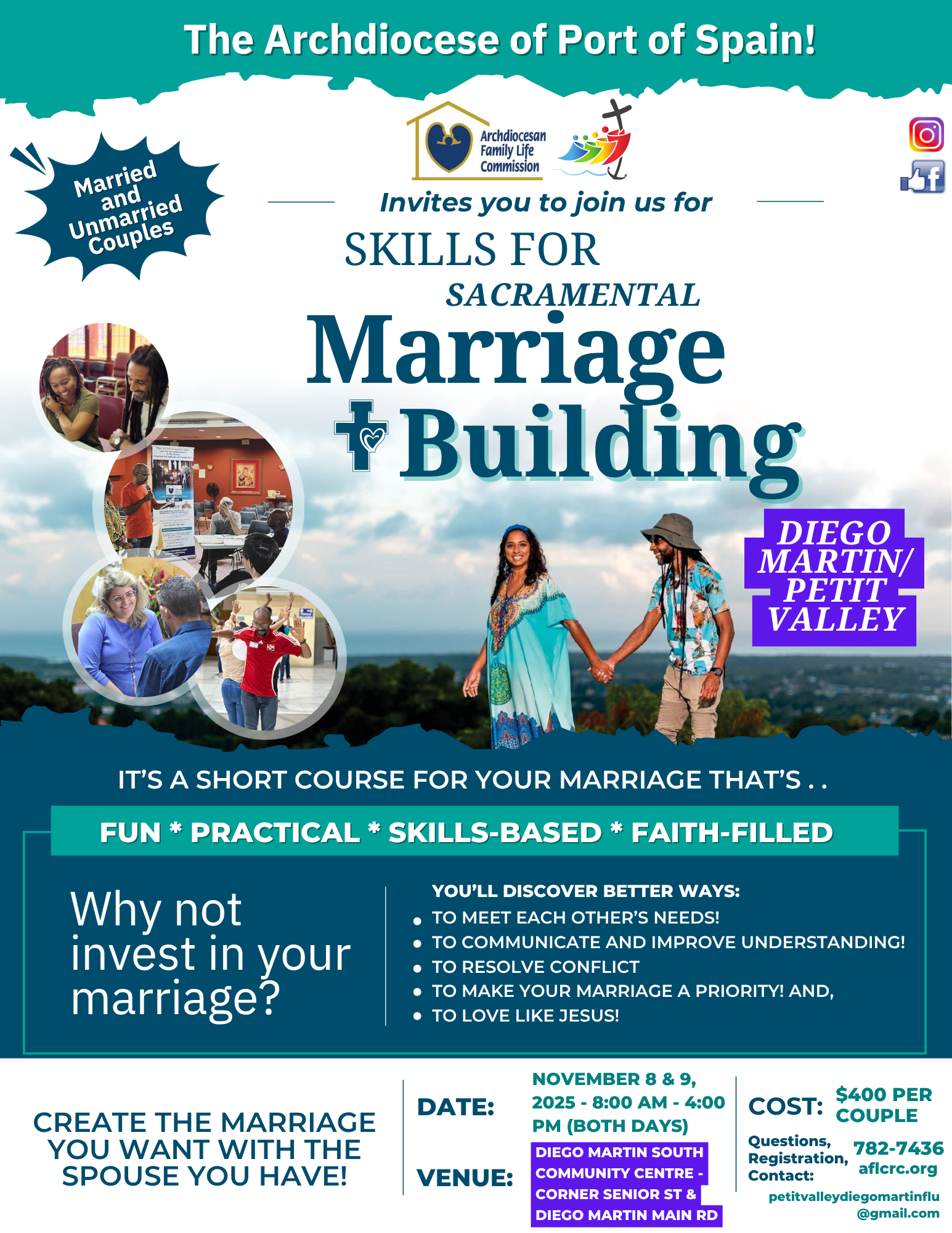 « All Events Skills for Sacramental Marriage Building – Diego Martin November 8 @ 8:00 am - November 9 @ 4:00 pm Prev Event REGISTER HERE: https://forms.office.com/r/2e5CbgAQz1 Add to calendar Google Calendar iCalendar Outlook 365 Outlook Live Details Start: November 8 @ 8:00 am End: November 9 @ 4:00 pm Event Category: Event Website: https://forms.office.com/r/2e5CbgAQz1 Organizer Archdiocesan Family Life Commission Phone: 299-1047 Email: familylife@catholictt.org Venue Diego Martin South Community Ctr