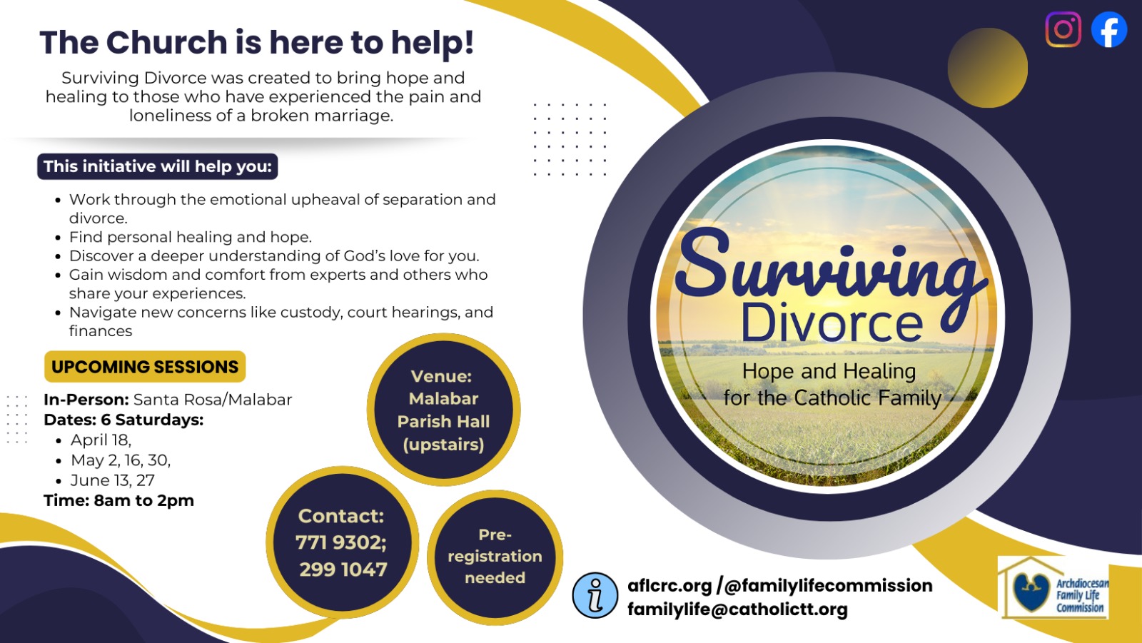 « All Events Surviving Divorce Sessions April 18 @ 8:00 am - 2:00 pm Prev Event Next Event Surviving Divorce: Registration Link: https://bit.ly/SurvivingDivorce2026 Add to calendar Google Calendar iCalendar Outlook 365 Outlook Live Details Date: April 18 Time: 8:00 am - 2:00 pm Event Category: Meeting Venue Santa Rosa/Malabar